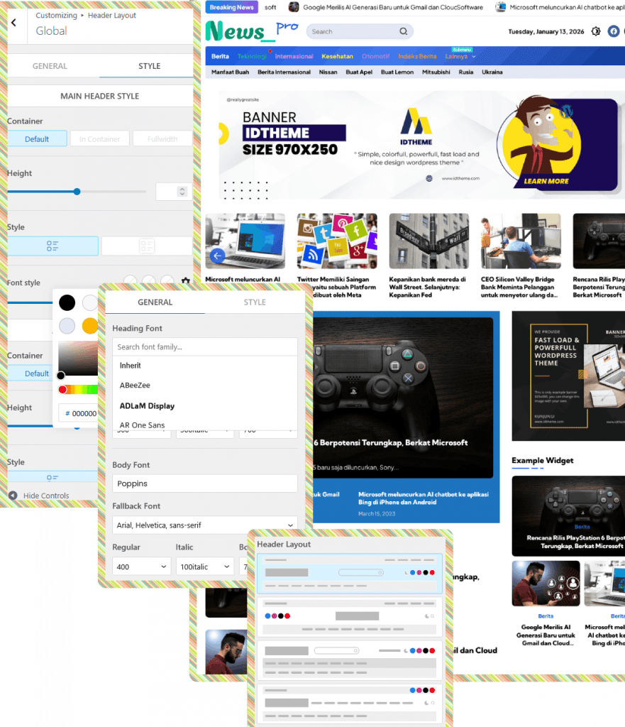 Atur hampir semua elemen website dengan mudah langsung dari WordPress Customizer. Mulai dari warna, tipografi, layout, hingga detail kecil setiap komponen – semuanya bisa kamu sesuaikan secara real-time tanpa menyentuh kode.